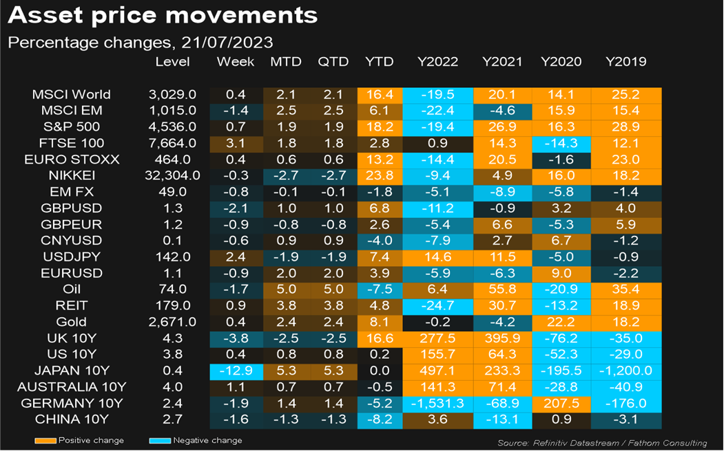 Lastly, we saw this week Russia renedge on the grain deal that was brokered by Turkey last year. This was preceded by an explosion on Russia’s flagship bridge connecting Crimea to the mainland. Conveniently, the explosion was not so severe and part of it was reopened quickly. To my mind it was a pure stunt that gave Russia grounds to justify a U-turn on the deal (by blaming events on two Ukrainian drones) – which it had long been threatening to do. The Black Sea deal allows for some 33mn tonnes of exports from Ukraine (51% = Corn, 27% = Wheat). How concerned should we be about another escalation in food prices? The full impact boils down to logistics and especially insurance costs. Already big insurers like Lloyds of London are reviewing insurance. The impact is worst on EM countries, many in Africa – Ghana, Nigeria and South Africa. Turkey’s President, Erdogan, will be discussing the situation with Putin when they meet in August. We have another quasi-oil situation – unless Russia turns its back on these EM nations, it will have to find a way to continue supplying them at a discount. That’s where logistics come into play – insurance alone is rocketing where available. Otherwise, Russia will choke them – that doesn’t bode well for the Russia / China alliance of EM nations. Looking at the latest wheat spot prices, yes prices jumped initially from $632.75 to $727.75 on the explosion and have now dropped back to $696.50. It is still well below the $1,006 back in Jan 2022. So how concerned should we be at this stage – not very.